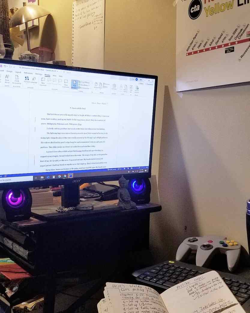 Had a great conversation yesterday with my editor (and breathed a giant sigh of relief when I realized all his edit proposals were straightforward and minor, nothing super big or structural). Here’s my editing station–N64 controller, stolen CTA map and all!