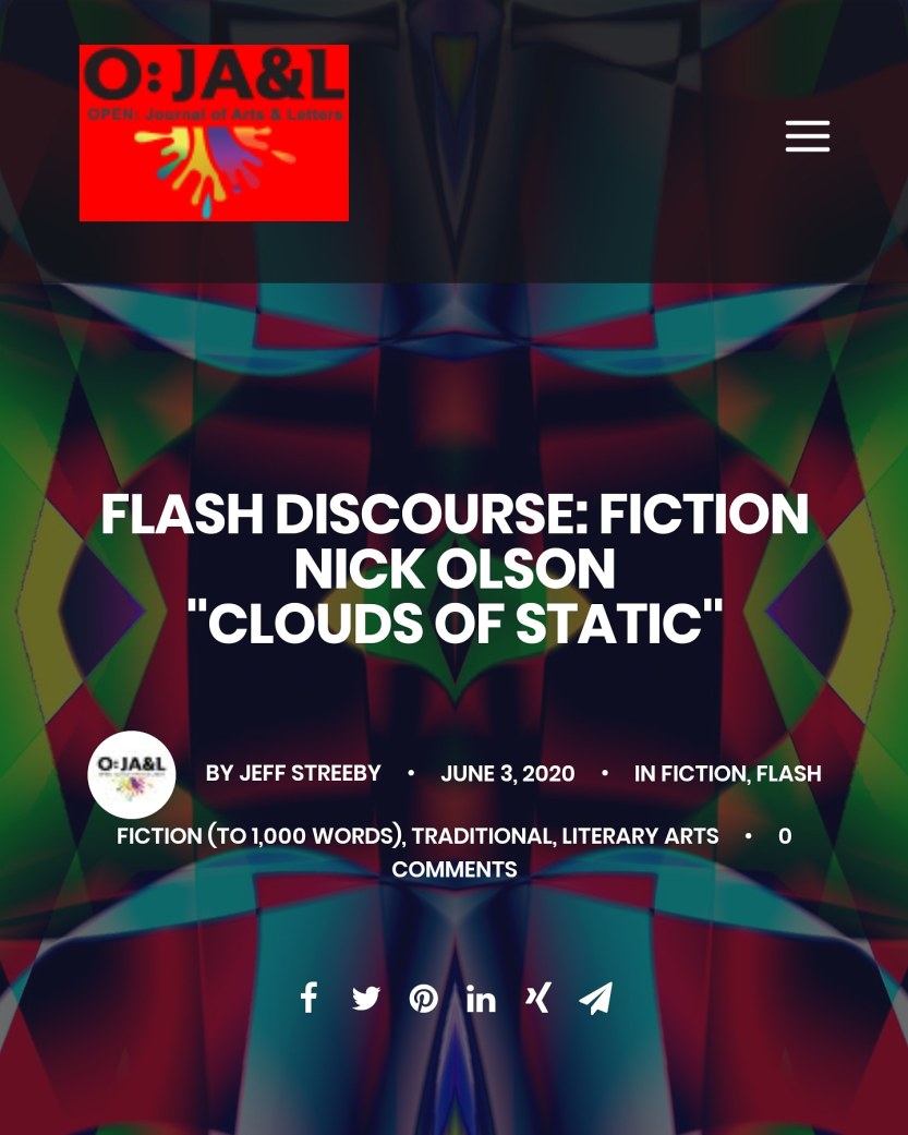 My flash piece “Clouds of Static” is live in OPEN: Journal of Arts & Letters! While you’re there, check out all the other work they publish too. They run a really great magazine over there.