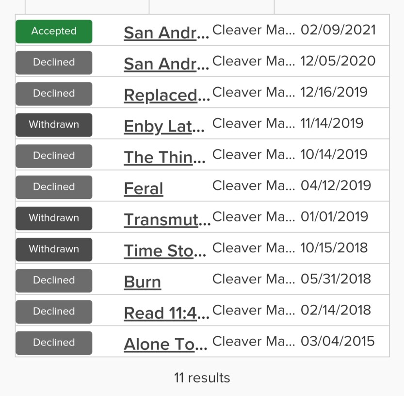 AHH!! My story “San Andreas Heaven,” a piece on grief through the lens of video game glitching, just got accepted by Cleaver Magazine! This is a dream for me. I’ve been trying them for years, and this story is an offshoot of my WIP novel The Brother We Share. Actual tears of joy.