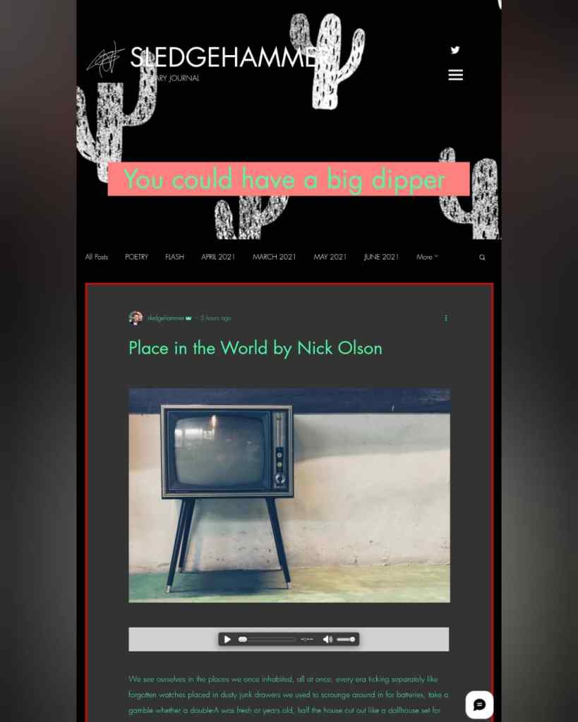Here’s the first piece from AFTERGLOW being pubbed, and in the amazing Sledgehammer Lit! This one’s a single sentence spec fic about the exact point of collapse. There’s an audio version too, so you can also listen to me read the piece! Big thanks to J Archer Avary for having me. 😊