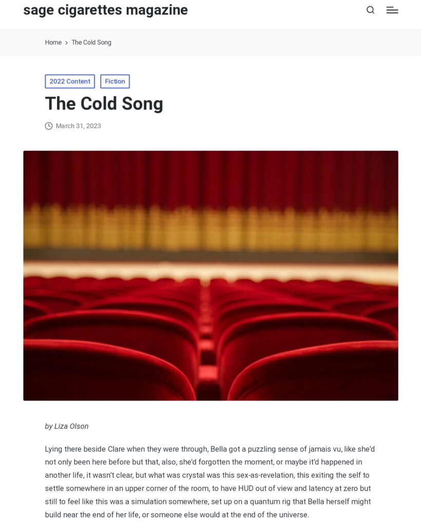 So excited to share this piece that just went live in Sage Cigarettes! This one’s from my WIP novel, and it’s got everything: queer love and longing, existentialism, Klaus Nomi fangirling, and digital archivism after the total destruction of the internet as we know it! Also, Clare is trans, so it’s perfect this is going live on Trans Day of Visibility!